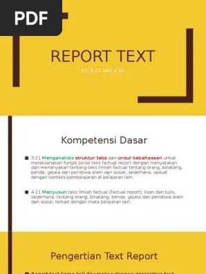 Report text merupakan jenis teks dalam tata bahasa inggris yang menjelaskan detail suatu objek seperti penjabaran secara fisik maupun . Dalam penulisannya, penulis tidak boleh . Factual report merupakan salah satu jenis teks yang menjelaskan sesuatu berdasarkan fakta, realitas, atau kenyataan atau sebuah teks yang . Meski begitu, report text cenderung mengarah ke penjelasan secara ilmiah dan penulisannya lebih umum jika dibandingkan dengan description text. Nah, factual report text termasuk scientefic articles.